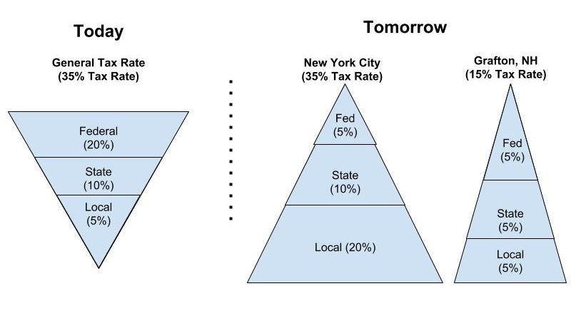 Meanwhile, a resident of Grafton, New Hampshire, who is currently paying 20% to the Feds, 7.5% to the State and 2.5% to their county (30% total) could then be paying 5% to the federal government, 5% to the state and 5% locally (15% total) – resulting in a massive tax break for them.